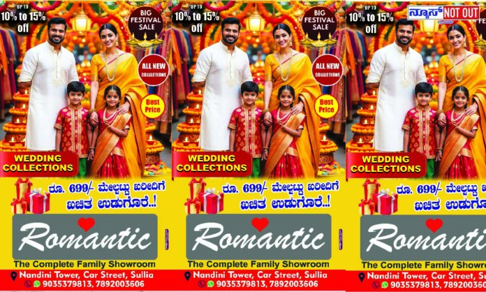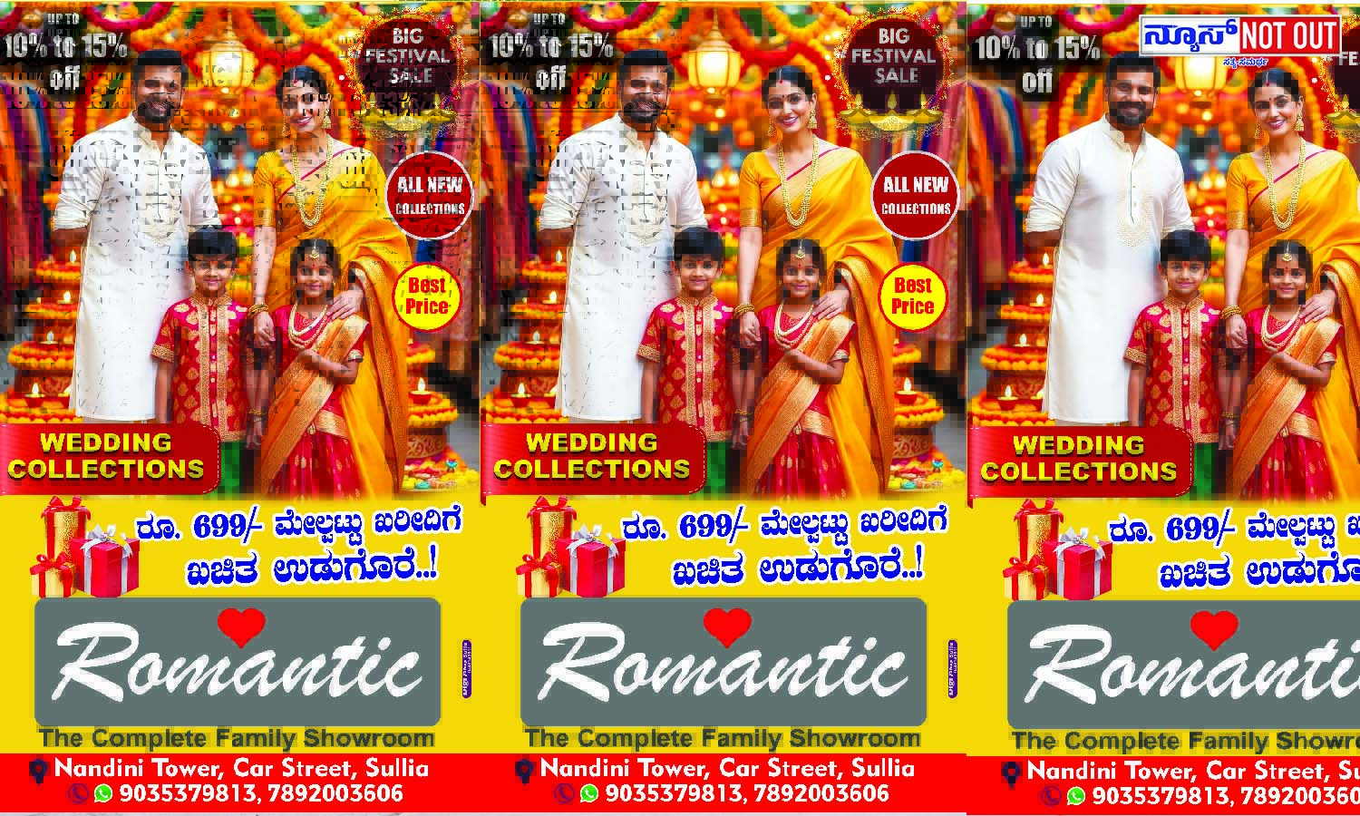 ಸುಳ್ಯ ರಥಬೀದಿಯಲ್ಲಿರುವ ರೊಮ್ಯಾಂಟಿಕ್ ವಸ್ತ್ರ ಮಳಿಗೆಯಲ್ಲಿ ಹಬ್ಬಗಳ ಸಂಭ್ರಮಕ್ಕೆಆಗಿ ವಿಶೇಷ ರಿಯಾಯಿತಿಗಳನ್ನು ನೀಡಲಾಗುತ್ತಿದೆ. ಪ್ರತೀ ಖರೀದಿಯ ಮೇಲೆ 10 ರಿಂದ ಶೇ. 15ರ ವರೆಗೆ ರಿಯಾಯಿತಿ ನೀಡಲಾಗುತ್ತಿದೆ. 699 ಮೇಲ್ಪಟ್ಟು ಖರೀದಿಗೆ ಖಚಿತ ಉಡುಗೊರೆ ನೀಡಲಾಗುತ್ತದೆ. ಹಬ್ಬಗಳ ಪ್ರಯುಕ್ತ ಮಳಿಗೆಯಲ್ಲಿ ಬಟ್ಟೆಗಳ ಹೊಸ ಸಂಗ್ರಹ ಬಂದಿದ್ದು, ಮದುವೆ ಸಮಾರಂಭದ ಅಪೂರ್ವ ಸಂಗ್ರಹವಿದೆ.