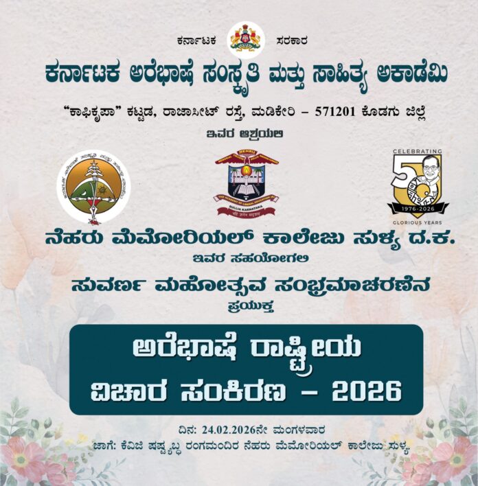 ನ್ಯೂಸ್ ನಾಟೌಟ್ :ಕರ್ನಾಟಕ ಅರೆಭಾಷೆ ಸಂಸ್ಕೃತಿ ಮತ್ತು ಸಾಹಿತ್ಯ ಅಕಾಡೆಮಿ ಇವರ ಆಶ್ರಯದಲ್ಲಿ ನೆಹರು ಮೆಮೋರಿಯಲ್ ಕಾಲೇಜು ಸುಳ್ಯ ಇದರ ಸಹಯೋಗದಲ್ಲಿ ಕಾಲೇಜಿನ ಸುವರ್ಣ ಸಂಭ್ರಮಾಚರಣೆಯ ಪ್ರಯುಕ್ತ ಅರೆಭಾಷೆ ರಾಷ್ಟ್ರೀಯ ವಿಚಾರ ಸಂಕಿರಣವು ಕೆ.ವಿ.ಜಿ shashtyabdha ರಂಗ ಮಂದಿರ ನೆಹರು ಮೆಮೋರಿಯಲ್ ಕಾಲೇಜು ಸುಳ್ಯ ಇಲ್ಲಿ 24-02-2026 ರಂದು ಮಂಗಳವಾರ ನಡೆಯಲಿದೆ.
